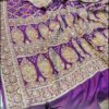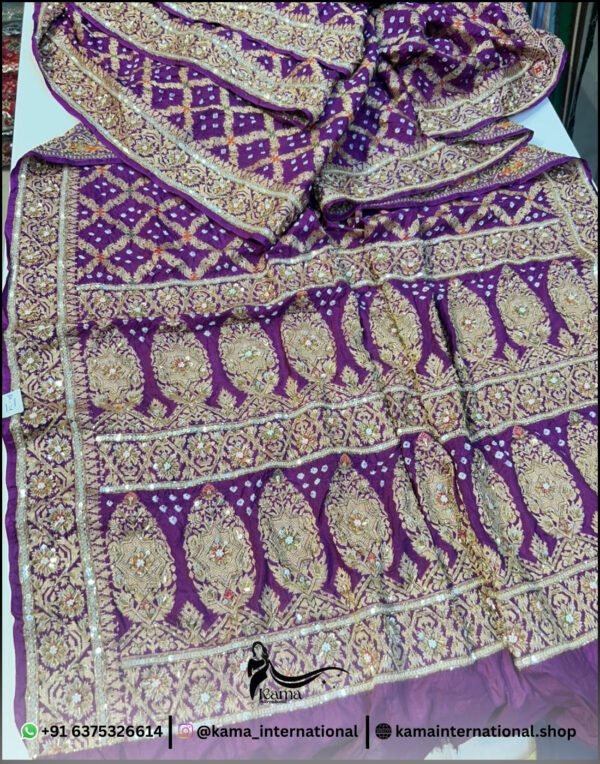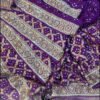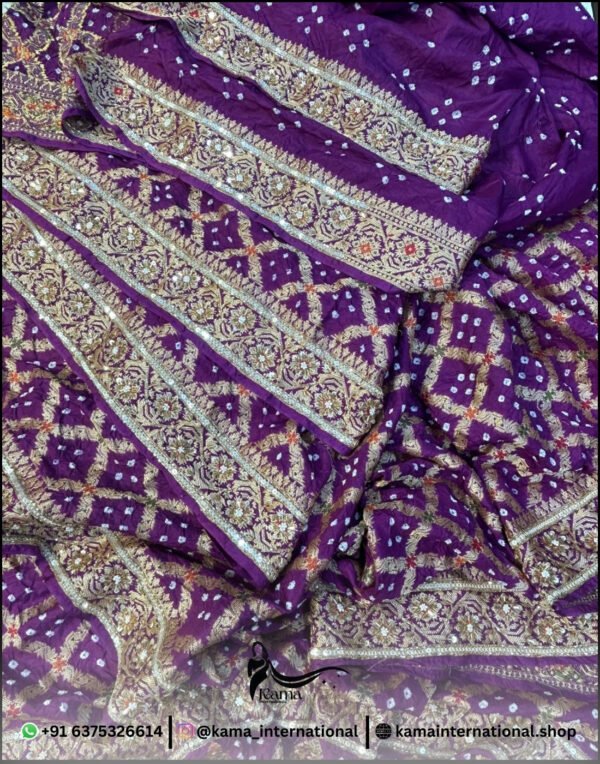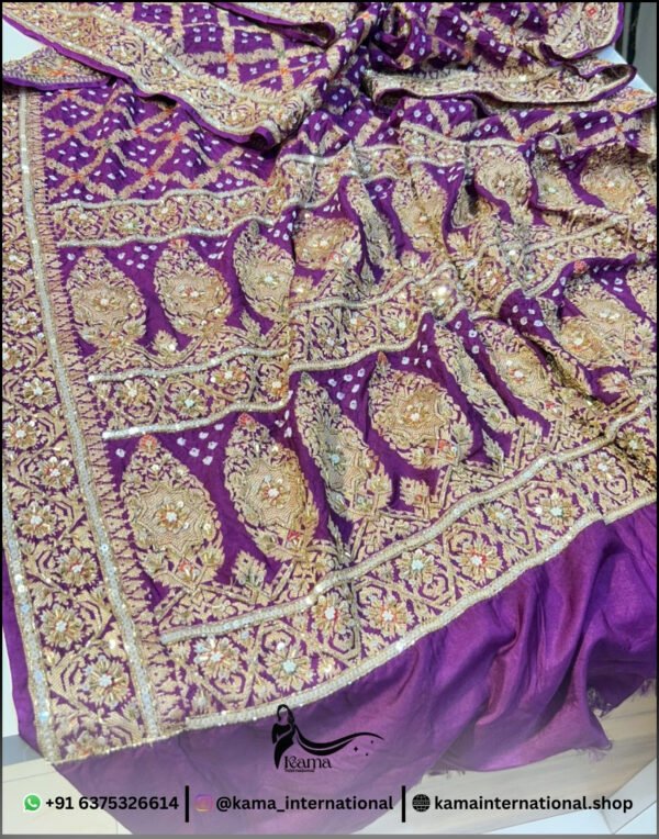 Beautiful dark purple pure Upada hand Bandhej saree… designed with rich traditional Bandhej pattern and enhanced with heavy Zardoji and fine cutdana handwork… giving it a royal and elegant look…
