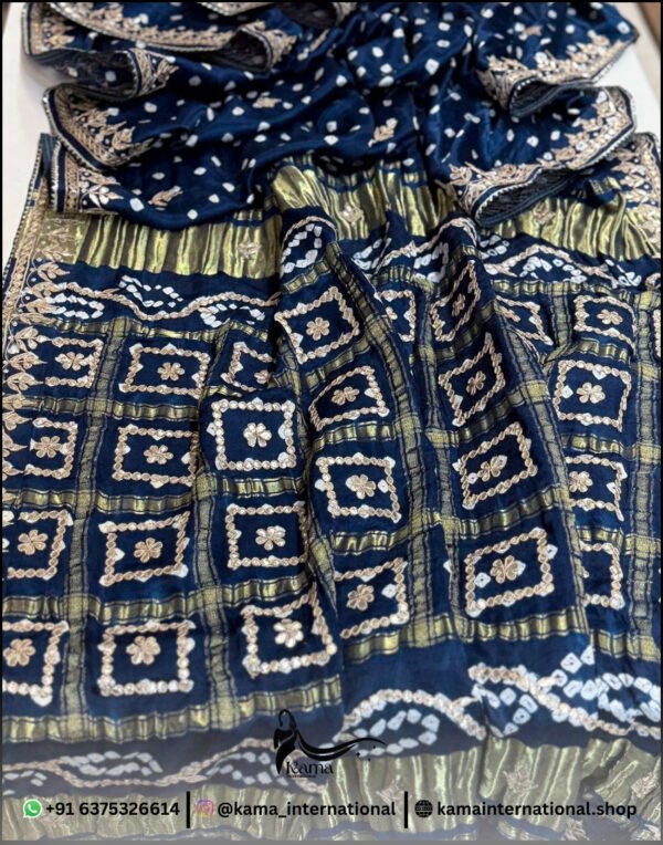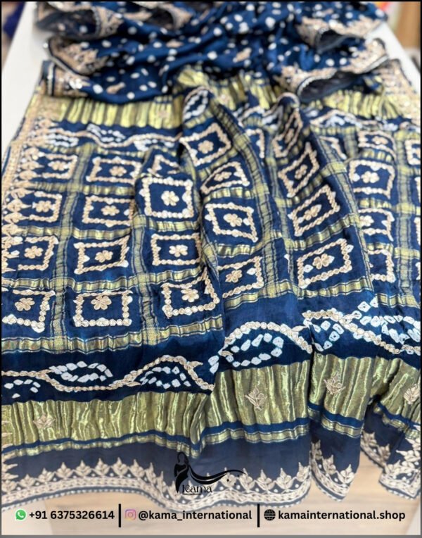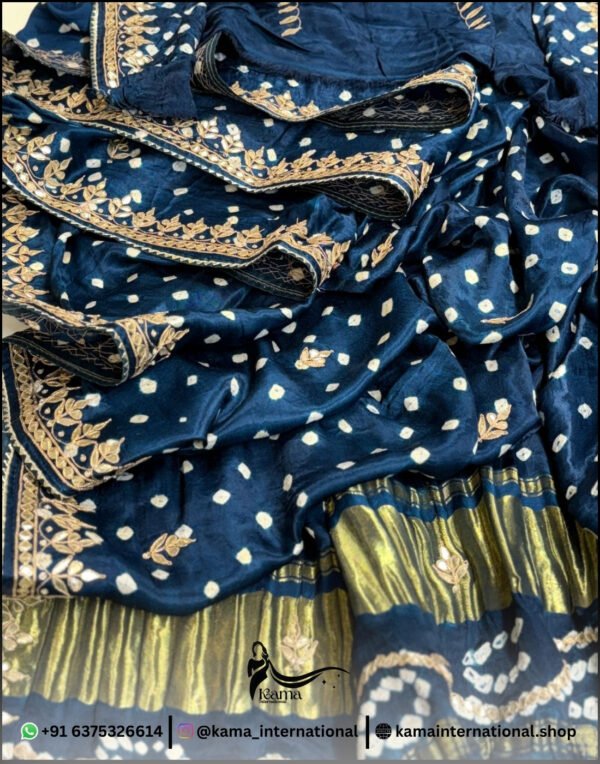 Beautiful pure Gazi silk saree… designed with elegant double lagddi patta pattern and enriched with heavy gotapatti and marodi handwork… giving it a rich traditional and festive appeal…