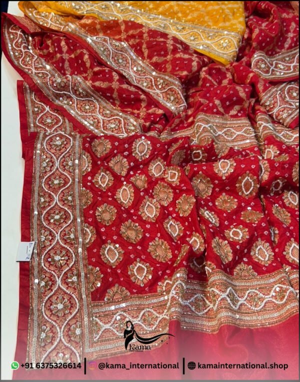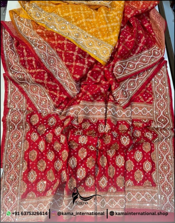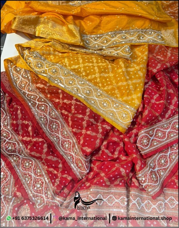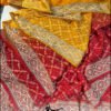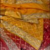 Beautiful multi shaded pure Upada silk Bandhej saree… designed with vibrant color play featuring red pallu and shoulder, paired with yellow patli and blouse… creating a stunning traditional contrast… enhanced with heavy pearl and sequence handwork for a rich festive appeal…